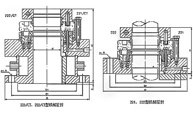 221、222型机械密封是一种径向双端面釜用机械密封,它特别适应轴向尺寸受限的工作场合,221型是承受强腐蚀性介质,可用在搪玻璃反应釜等上;222型适应弱腐蚀性介质,常与不锈钢等釜配套使用。
